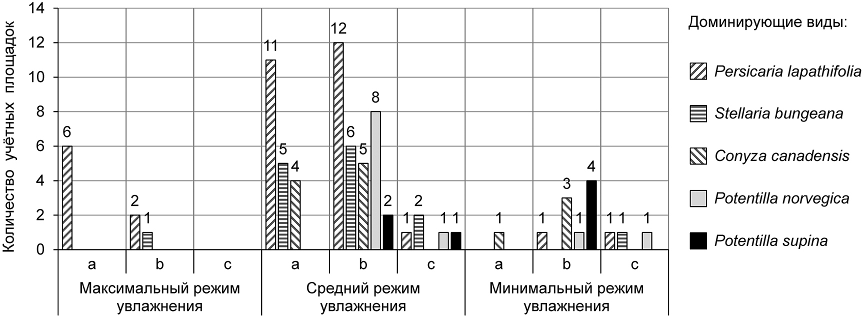 Оставшиеся 26 УП не отнесены ни к одной из этих группировок в связи с малой информативностью. Так, на некоторых из них присутствовали виды, встреченные единично, например, в наиболее увлажненной зоне это Butomus umbellatus L., Eleocharis acicularis (L.) Roem. et Schult., а в наименее увлажненной – Chenopodium album L., Galeopsis speciosa Mill., Melilotus albus L. и др. На других УП относительно часто встречающиеся виды: Plantago major L., Tussilago farfara L., Verbascum thapsus L. доминировали всего в 2–4 случаях.