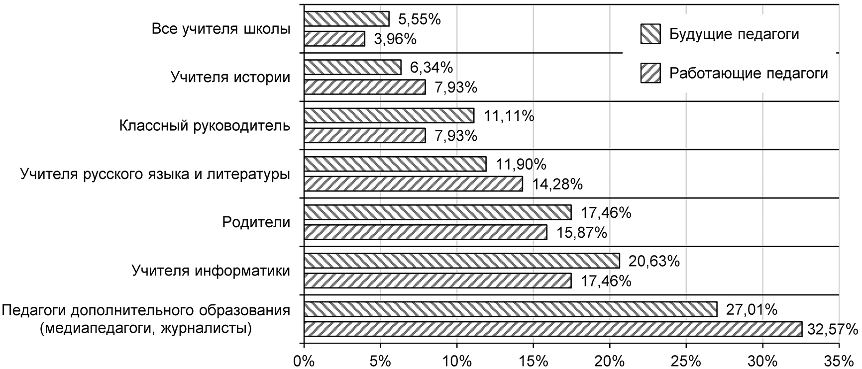 Рисунок 1 – Мнение будущих и работающих педагогов о том, кто в школе отвечает за медийно-информационную грамотность школьников