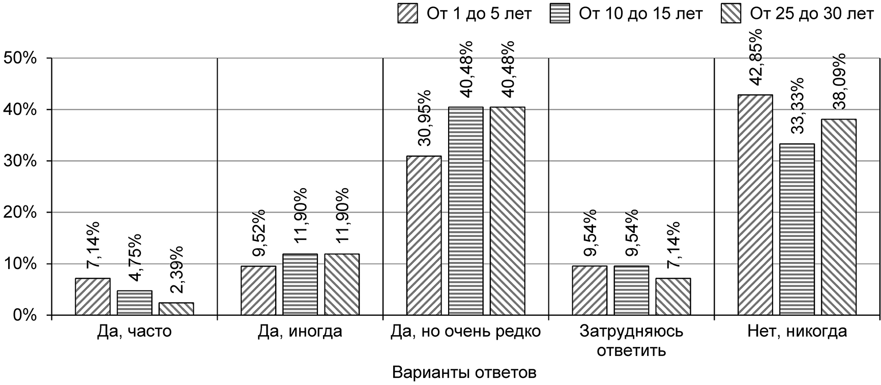 Распределение ответов учителей с разным стажем профессиональной деятельности на вопрос о том, используют ли они на своих уроках элементы медиаобразования (рис. 2), свидетельствует об игнорировании многими из них задачи формирования у обучающихся медийно-информационной грамотности.