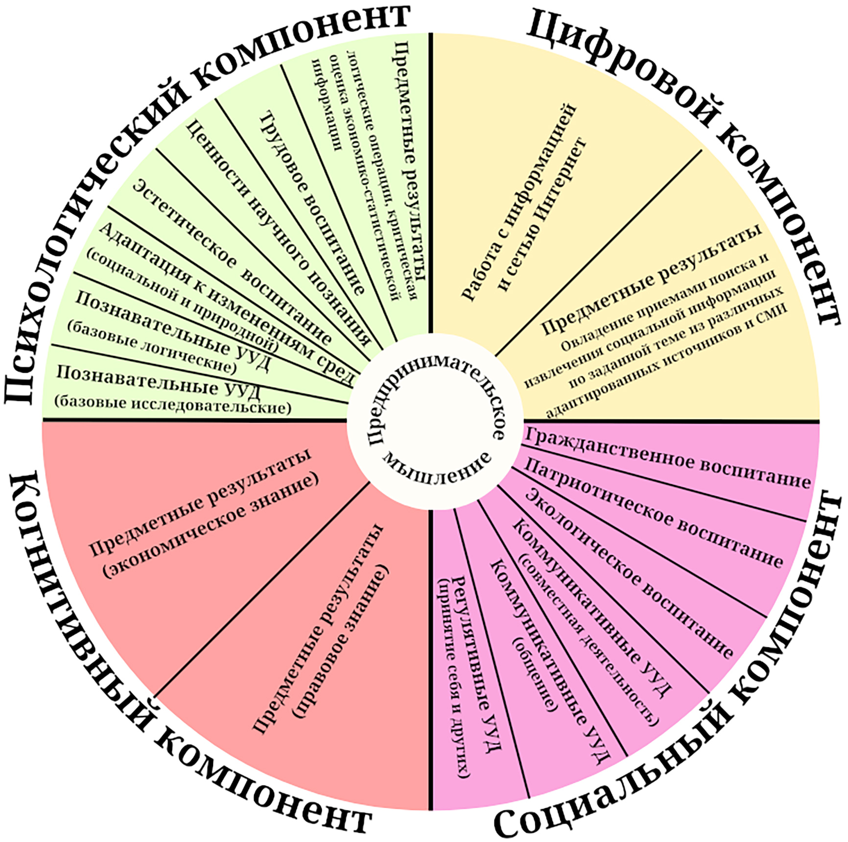В психологический компонент входит способность к критическому мышлению, креативности, а также определенные личностные качества, например, гражданская идентичность. Когнитивный компонент включает теоретические темы, позволяющие понимать основные механизмы экономики, предпринимательства. Без данного компонента формирование предпринимательского мышления невозможно, так как именно это дает определенный старт. Социальный компонент раскрывает способность обучающихся к кооперации, а также к свободной коммуникации. Цифровой компонент был выделен с целью формирования умений работать в цифровой среде, использовать различные инструменты, чувствовать информационные потоки, тренды и др.