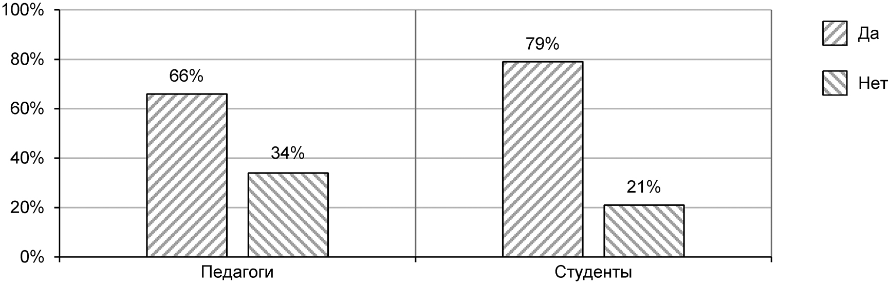 На вопрос «Согласны ли Вы с утверждением, что оценивать обучающихся должны только педагоги, как эксперты в своей области знаний?», согласием ответило значительное число и студентов (79%), и преподавателей (66%) (рис. 1).