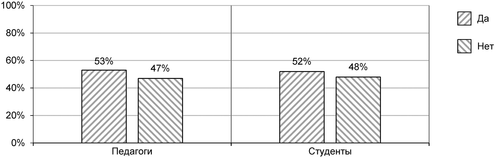 На вопрос «Можно ли, по Вашему мнению, доверять самооценке и взаимооценке обучающихся при выставлении отметок по результатам работы?» среди обеих групп опрашиваемых мнения разделились почти поровну: «да» ответили 52% студентов и 53% преподавателей. Среди причин недоверия к взаимооценке студентов указывались личные отношения между обучающимися и, как следствие этого, субъективность мнения. Эти комментарии также отражают низкое развитие навыка самооценки, с опорой на субъективные критерии (дружба, неприязнь и другое), а также признание со стороны педагогов недостаточности развития у студентов навыков взаимооценки (рис. 2).