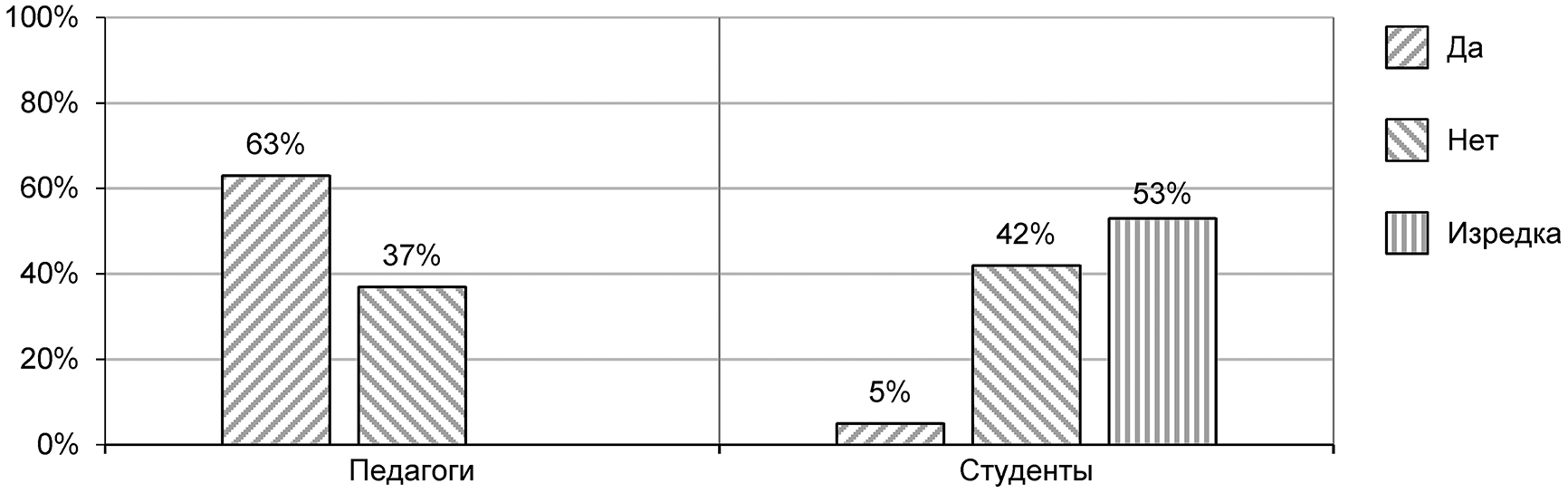 Следующие вопросы касались целесообразности применения взаимооценки студентов в ходе учебного процесса с точки зрения преподавателей («да» ответили почти 63% опрошенных) в сравнении с частотой приглашения студентов выступить с оценкой одногруппников («да» ответили только 5% студентов, вариант «изредка» выбрали 53% опрошенных) (рис. 3).