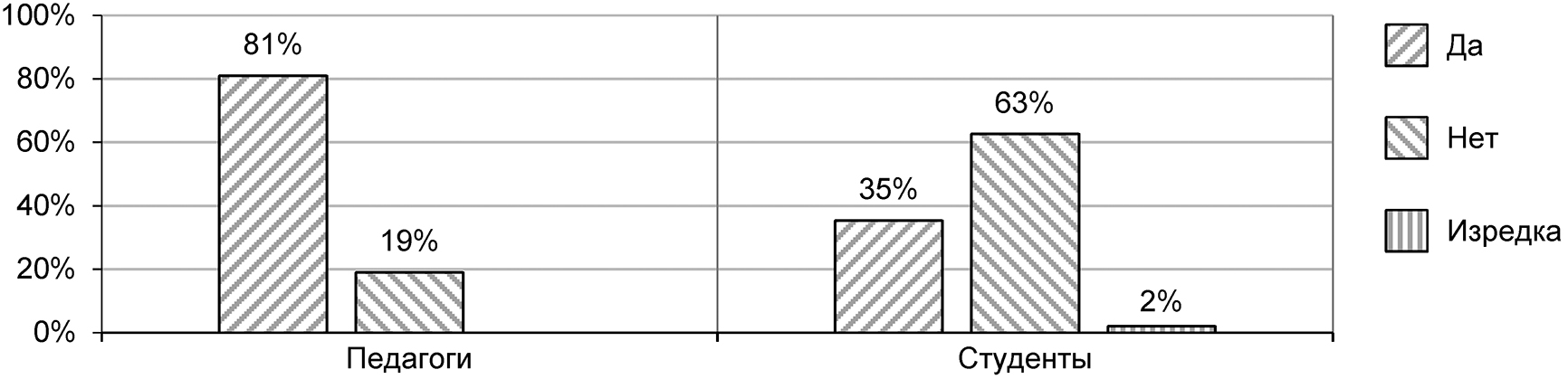 При этом на вопрос «Можете ли Вы наделить студента ролью эксперта при обсуждении результатов выполнения заданий?» 81% преподавателей выразили такую готовность, что контрастировало с ответами студентов на вопрос приглашают ли их к участию в жюри или в качестве экспертов на занятиях, на который «да» ответили 35% студентов (рис. 4). При этом в комментариях большинство студентов отметило, что это происходит довольно редко и им хотелось бы чаще выступать в данной роли.