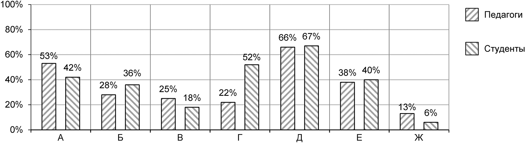 Рисунок 5 – Распределение ответов на вопрос «Какие из современных средств оценки Вы применяете в своей работе?» по мнению преподавателей в сравнении с распределением ответов на вопрос «Какие формы работы, по вашему мнению, педагоги должны включать в учебные курсы, чтобы более точно оценить знания и умения студентов?» среди обучающихся вузов: А – отчет обучающихся о работе в течение курса, самооценка и взаимооценка работы; Б – конференция по индивидуальным работам/проектам обучающихся; В – составление портфолио индивидуальных достижений; Г – предметная/деловая игра; Д – тестирование; Е – написание эссе, докладов, рефератов; Ж – написание рецензий и аннотаций