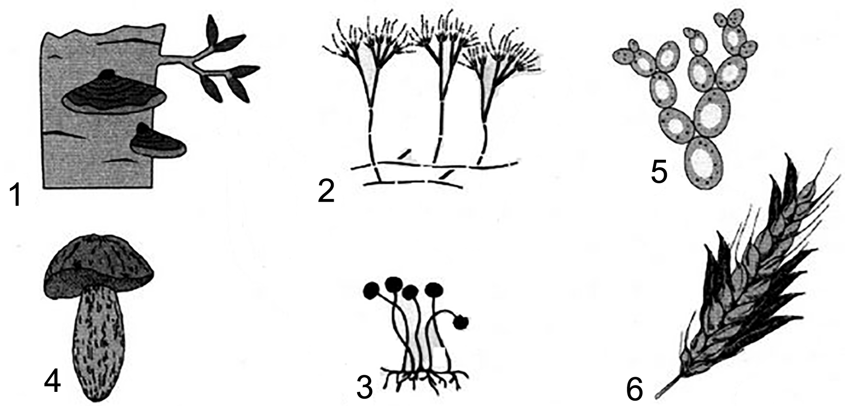 - В норе Нюхлера вы видели субстратный мицелий грибов. На поверхности земли можно встретить воздушную часть мицелия. Рассмотрите различные грибы (рис. 4) и подберите к ним соответствующие признаки: А) образует микоризу, Б) в 1929 г. открыл А. Флеминг, В) плесневый с многоклеточной грибницей, Г) делятся на трубчатые и пластинчатые, Д) паразитирует на деревьях, Е) низшие грибы. Ответ: 422413.