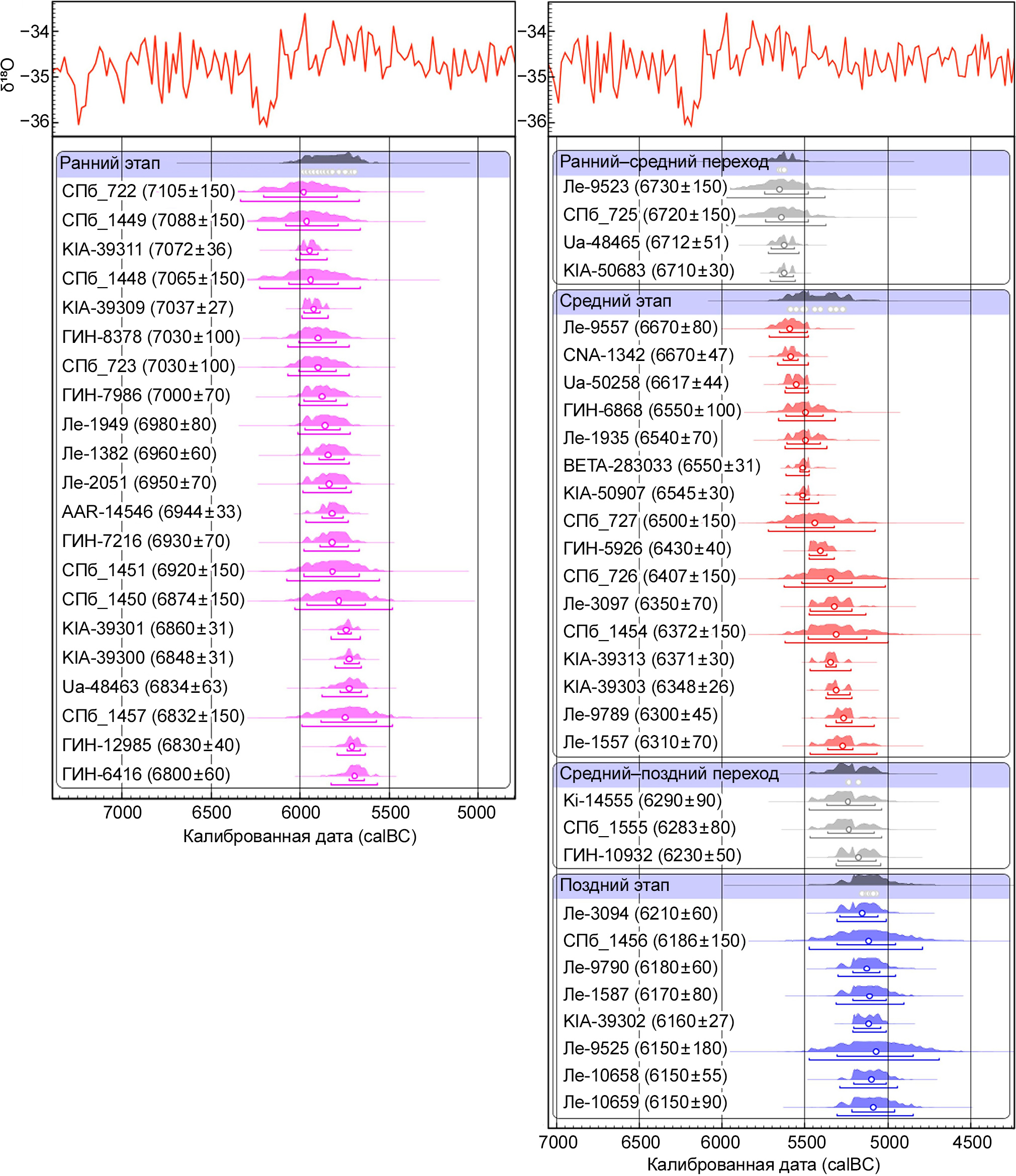 Ранний неолит Волго-Окского междуречья, по мнению большинства специалистов, представлен верхневолжской культурой. По ряду показателей (стратиграфия, типология и др.) выделяется несколько этапов ее развития [7, с. 19–20]. С накоплением радиоуглеродных дат для нескольких памятников были уточнены хронологические рамки культуры в целом [8, с. 13–20]. Особое значение имели результаты для раннего этапа, так как начало неолита было одним из наиболее актуальных вопросов [9, с. 6–10]. В этом аспекте видится важной мысль В.М. Лозовского, который предполагал поликультурную мезолитическую основу в интересуемом регионе, на которую наложилась керамическая традиция, привнесённая населением с юга [10]. С учетом специфики как стратиграфии и планиграфии стоянок Окаемово 5 и Озерки 17 [11, с. 99–103] имеет смысл рассматривать данные по периодизации и хронологии по наиболее четко стратифицированному памятнику – Сахтыш-2а [12, с. 41–45], а по керамике проведен всесторонний анализ [13, с. 159–164]. Здесь необходима одна ремарка: в предлагаемой работе учтены только те даты, у которых есть значение δ13C и оно больше −28‰. То есть, они не подвержены резервуарному эффекту (рис. 1). Наиболее достоверно выделяется неорнаментированная плоскодонная керамика с примесью только раковины и горизонтальным рядом сквозных отверстий под срезом венчика, возможно с раздельными наколами овальной формы [13, с. 159]. По нагару с такой керамики получены даты около 7100 BP и, учитывая значение δ13C более −27‰ (табл. 1: 1, 2) можно предполагать их валидность. Подтверждением могут служить даты по дереву со стоянки Становое-4 и Замостье 2 (табл. 1: 3, 4). В дальнейшем были получены совпадающие значения и по нагару с керамики последнего памятника [14, с. 190]. Они не подвержены резервуарному эффекту при допустимом δ13C (табл. 1: 5, 6). Закрепили эту версию и результаты, полученные на АМS, для стоянки Сахтыш-2а по нагару, неподверженному резервуарному эффекту (табл. 1: 7, 8) [15, p. 1036]. Таким образом, вполне вероятна гипотеза о начальном моменте неолитизации Верхнего Поволжья в интервале от 7100 до 7000 BP. Эту версию подкрепляет и серия максимально близких дат порядка 6980–6920 BP, полученных ранее для четырех памятников по дереву и углю (табл. 1: 9–12), включая стоянку Озерки 5. Они в дальнейшем подтвердились как по нагару с δ13C без влияния резервуарного эффекта (табл. 1: 13) на Сахтыше-2а, так и на АМS по костям лося для стоянки Озерки 5 (табл. 1: 14). Несмотря на то, что в работе почти не привлекаются даты по сапропелю около 6800 BP, тем не менее имеется девять дат по трем стоянкам со сходными параметрами. Первые две были получены в ГИНе по верше и черепу лося (табл. 1: 15, 16). Остальные сделаны по нагару, как традиционной методикой (табл. 1: 17, 19), так и на AMS в лабораториях г. Уппсала и г. Киль (табл. 1: 18, 21–23). Они совпали как по датам, так и по δ13C, что указывает на отсутствие резервуарного эффекта. Особо следует отметить дату по волокну ивы (табл. 1: 20), которая соответствует приведенные выше значения порядка 6850 BP. Исследователи отмечают, что в это время могла появиться посуда с разреженными каплевидными наколами [13, с. 160]. В лабораториях г. Санкт-Петербурга были получены две совпадающие даты (табл. 1: 23, 24) для стоянки Замостье 2 по дереву, а затем и нагару около 6700 BP. Они имеют поправки около 150 лет, а две аналогичные с ними даты на АМS от 30 до 50 лет (табл. 1: 25, 26). Это позволяет предпол