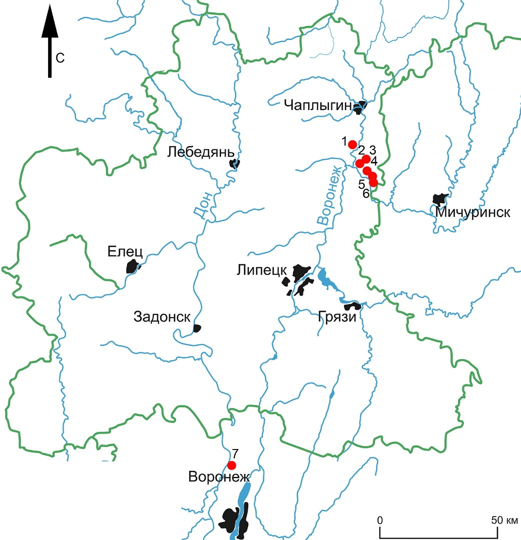 Рисунок 1 – Карта памятников части территории Верхнего Подонья с изделиями, изготовленными из керамических стенок сосудов эпохи энеолита: 1 – поселение Васильевский Кордон 7; 2 – поселение Васильевский Кордон 17; 3 – поселение Васильевский Кордон 27; 4 – стоянка Подзорово; 5 – поселение Старое Тарбеево 11; 6 – поселение Доброе 7; 7 – стоянка Ямное