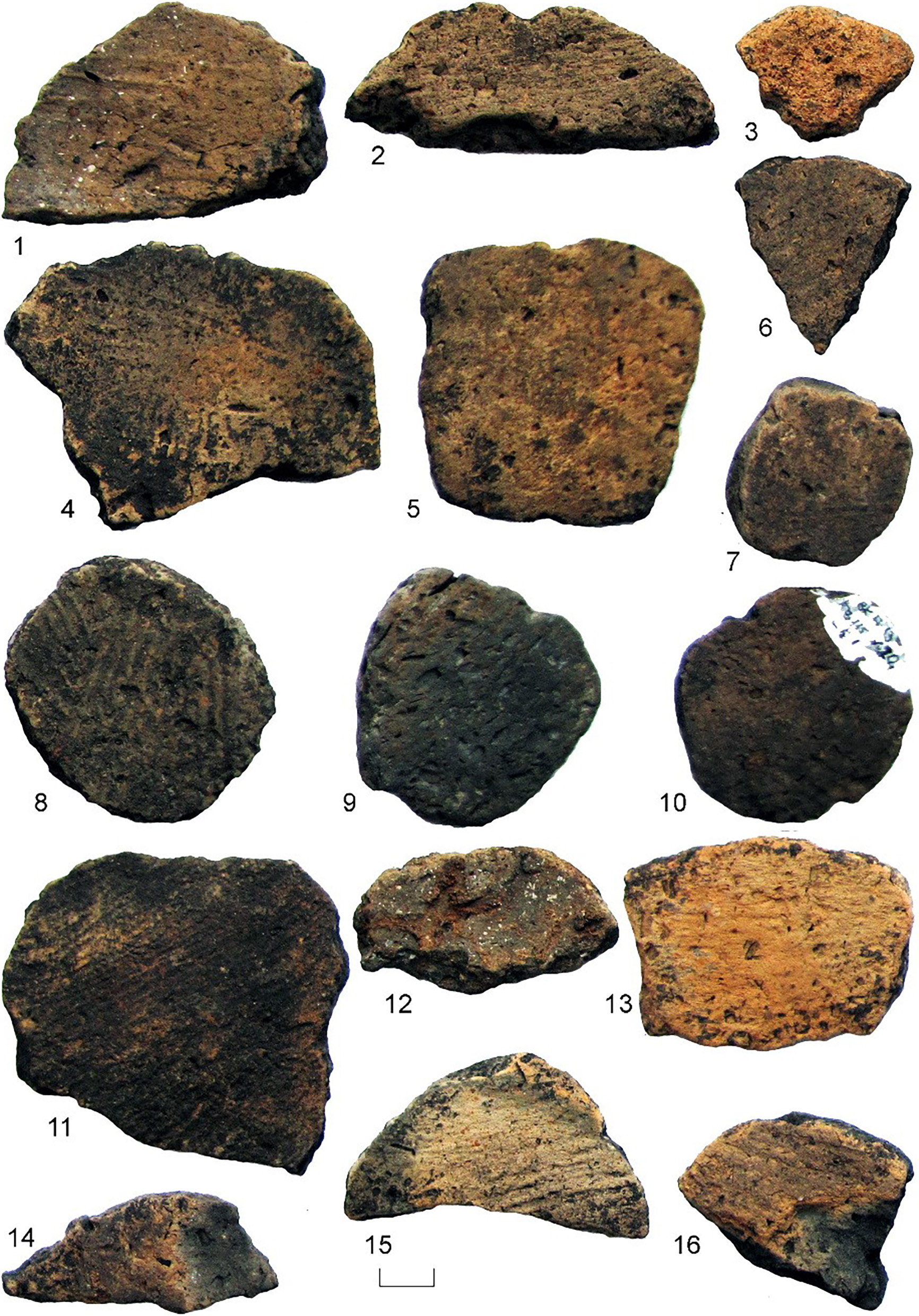 Рисунок 3 – Изделия (1–16) из керамических стенок сосудов среднестоговской культуры с поселения и грунтового могильника Васильевский Кордон 17