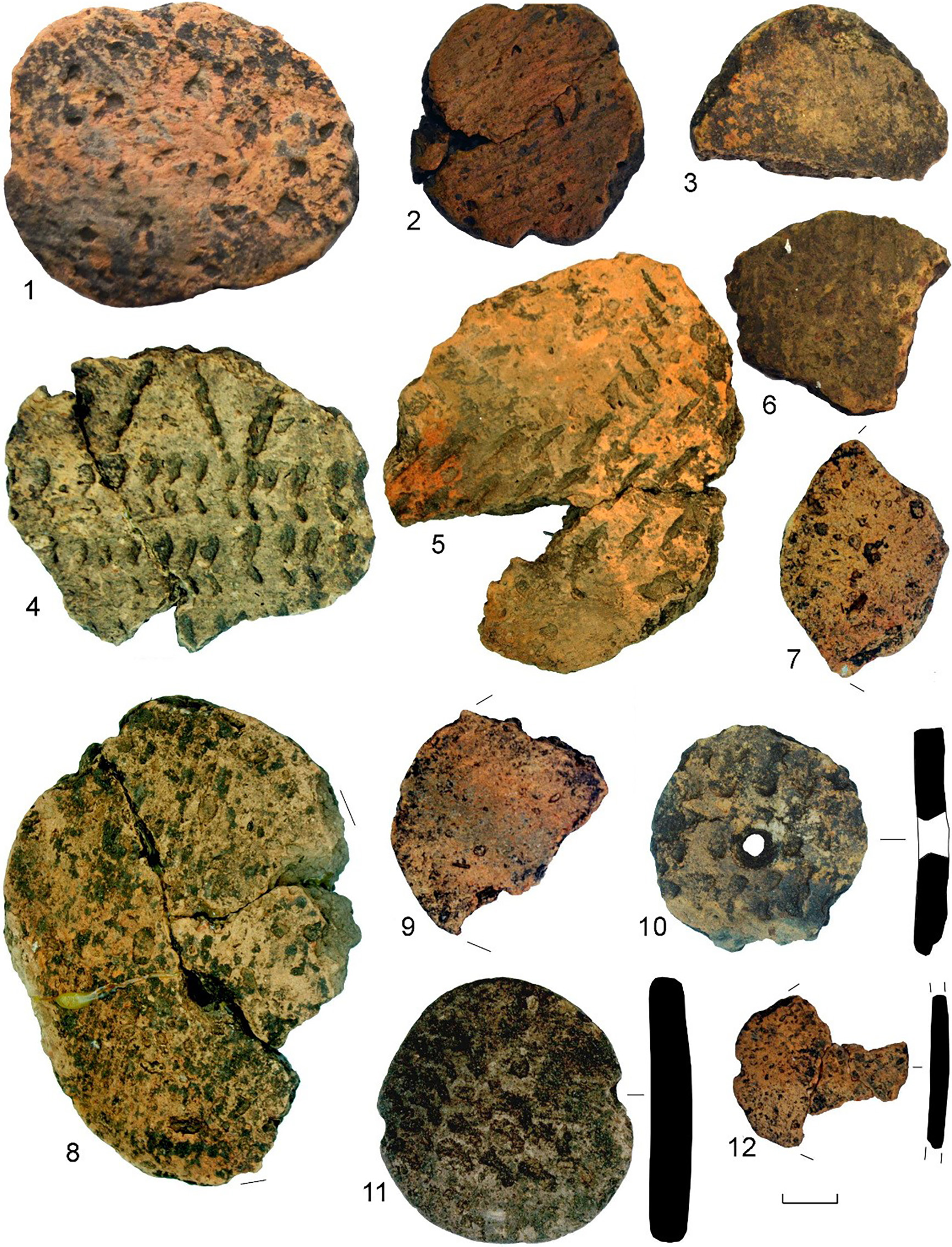Всего с памятника происходит 56 интересующих нас керамических изделий (рис. 2–9; рис. 10: 1, 2). 50 из них сделаны из керамических стенок среднестоговских сосудов и только шесть из стенок сосудов ксизовского типа (рис. 6: 5, 6; рис. 7: 7, 8; рис. 10: 1, 2) Они обнаружены в культурном слое памятника, а также в заполнении котлованов постройки 4, ямы 6 и в погребальной яме погребения 2.