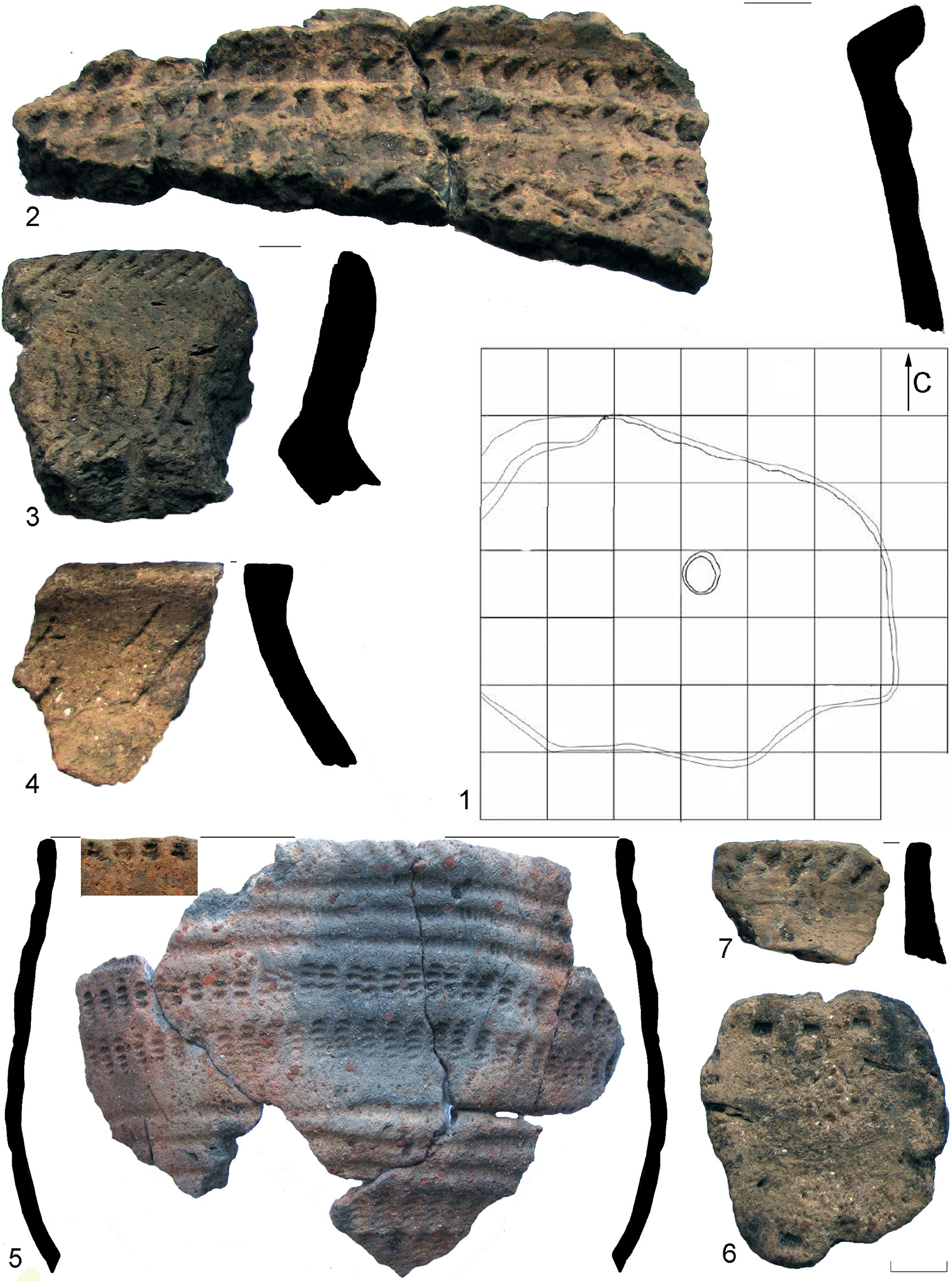 Рисунок 11 – Поселение Васильевский Кордон 27: 1 – план постройки 6; 2–7 – изделия из керамических стенок сосудов среднестоговской культуры из постройки 6