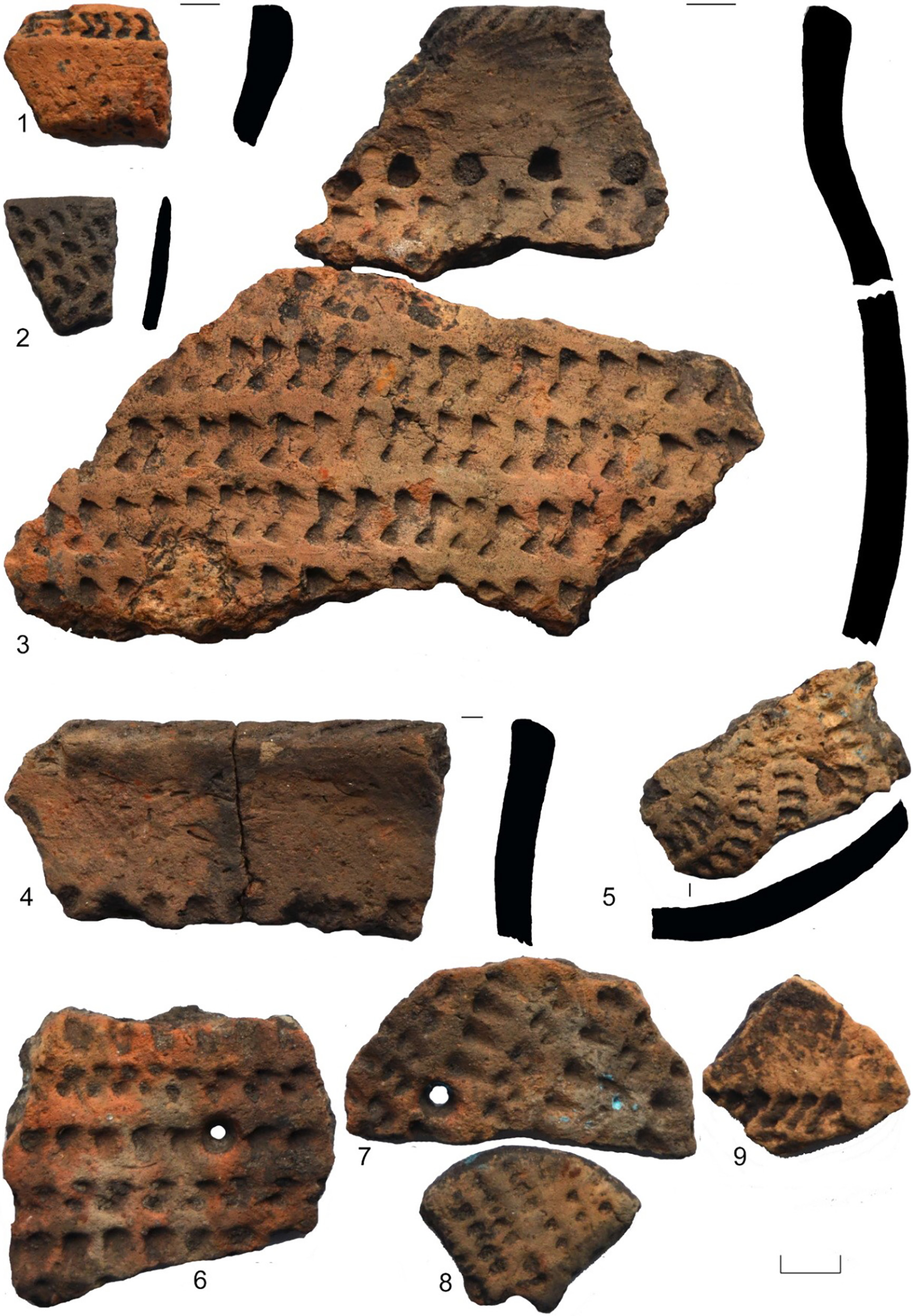 Рисунок 7 – Поселение и грунтовый могильник Васильевский Кордон 17. Постройка 4: 1–9 – керамика ксизовского типа (8, 9 – изделия из керамических стенок сосудов)