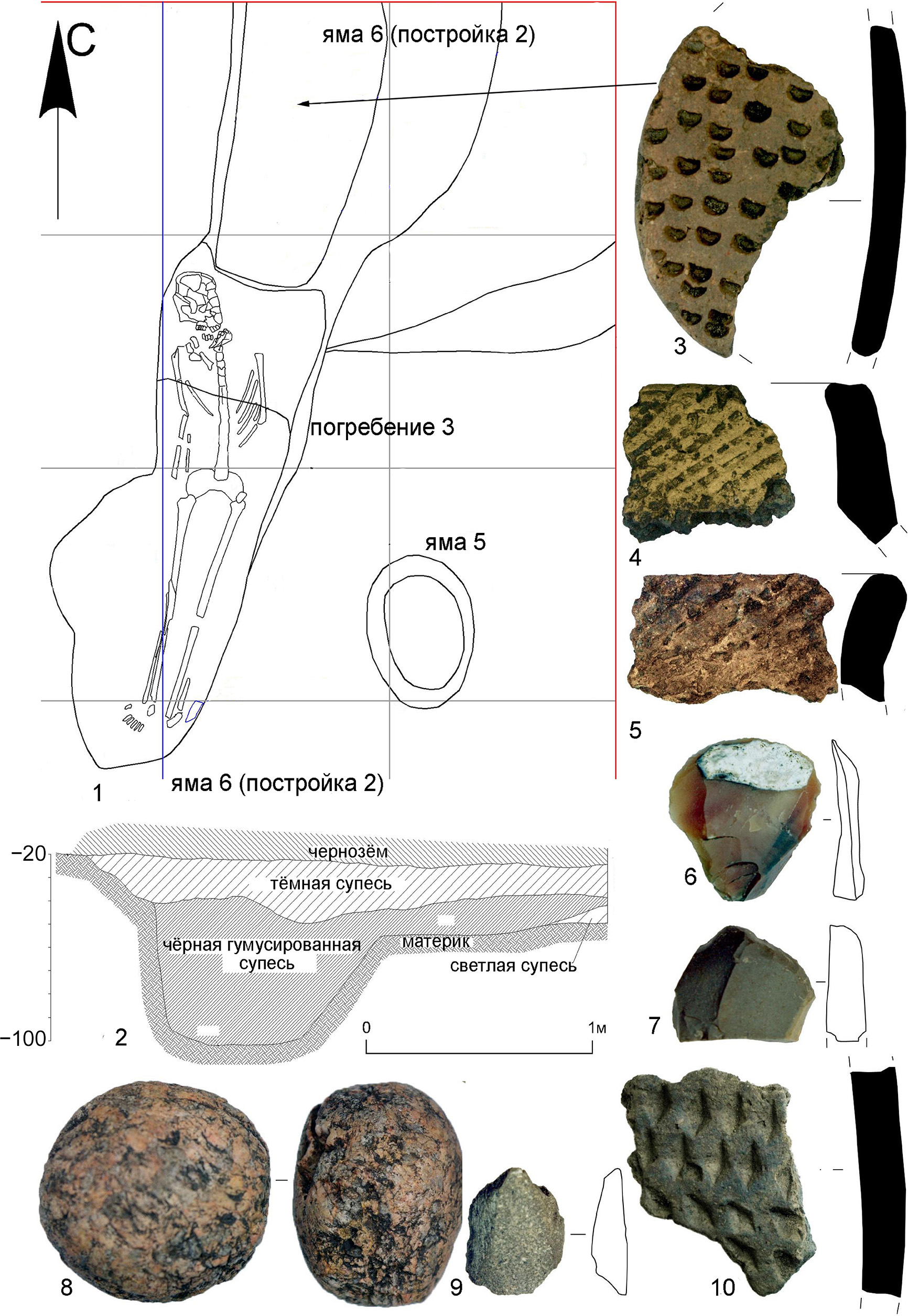 Рисунок 9 – Поселение и грунтовый могильник Васильевский Кордон 17: 1, 2 – план и профиль ямы 6; 3–10 – находки из ямы 6 (3 – изделие из керамической стенки сосуда среднестоговской культуры; 4, 5 – керамика среднестоговской культуры; 6–9 – изделия из камня; 10 – ромбоямочная керамика позднего неолита)