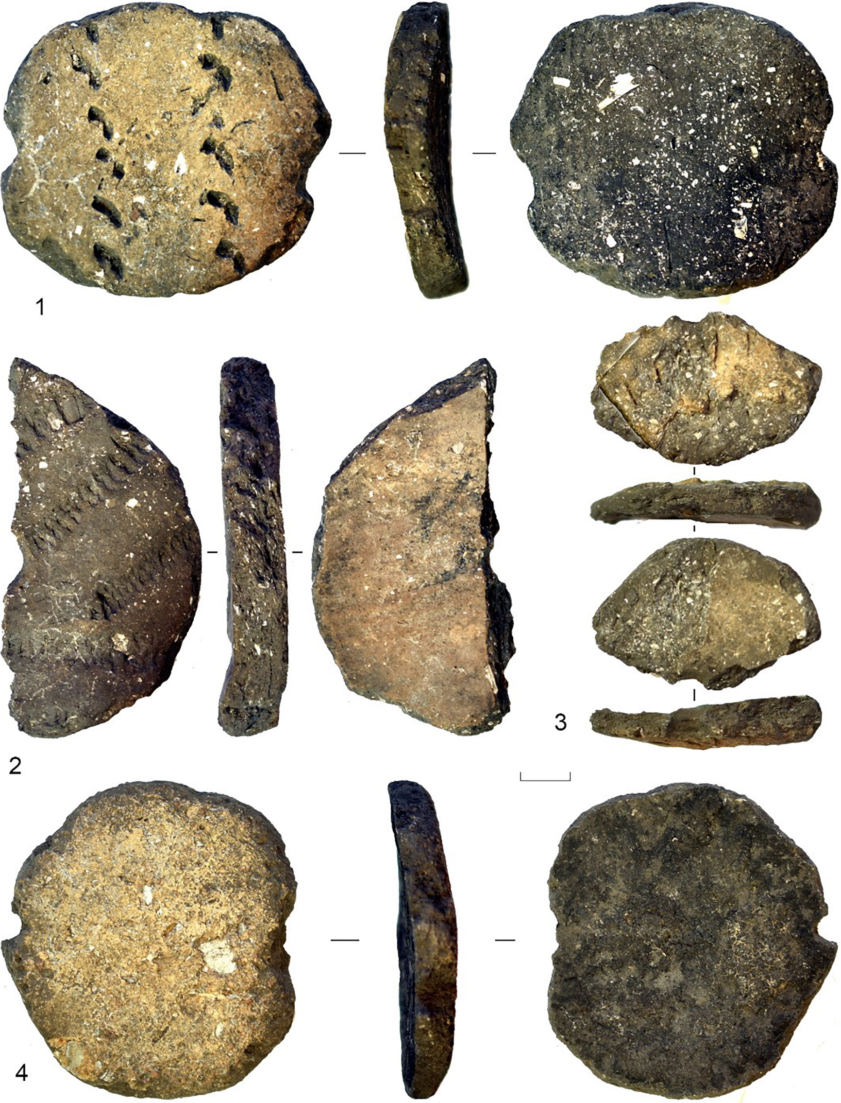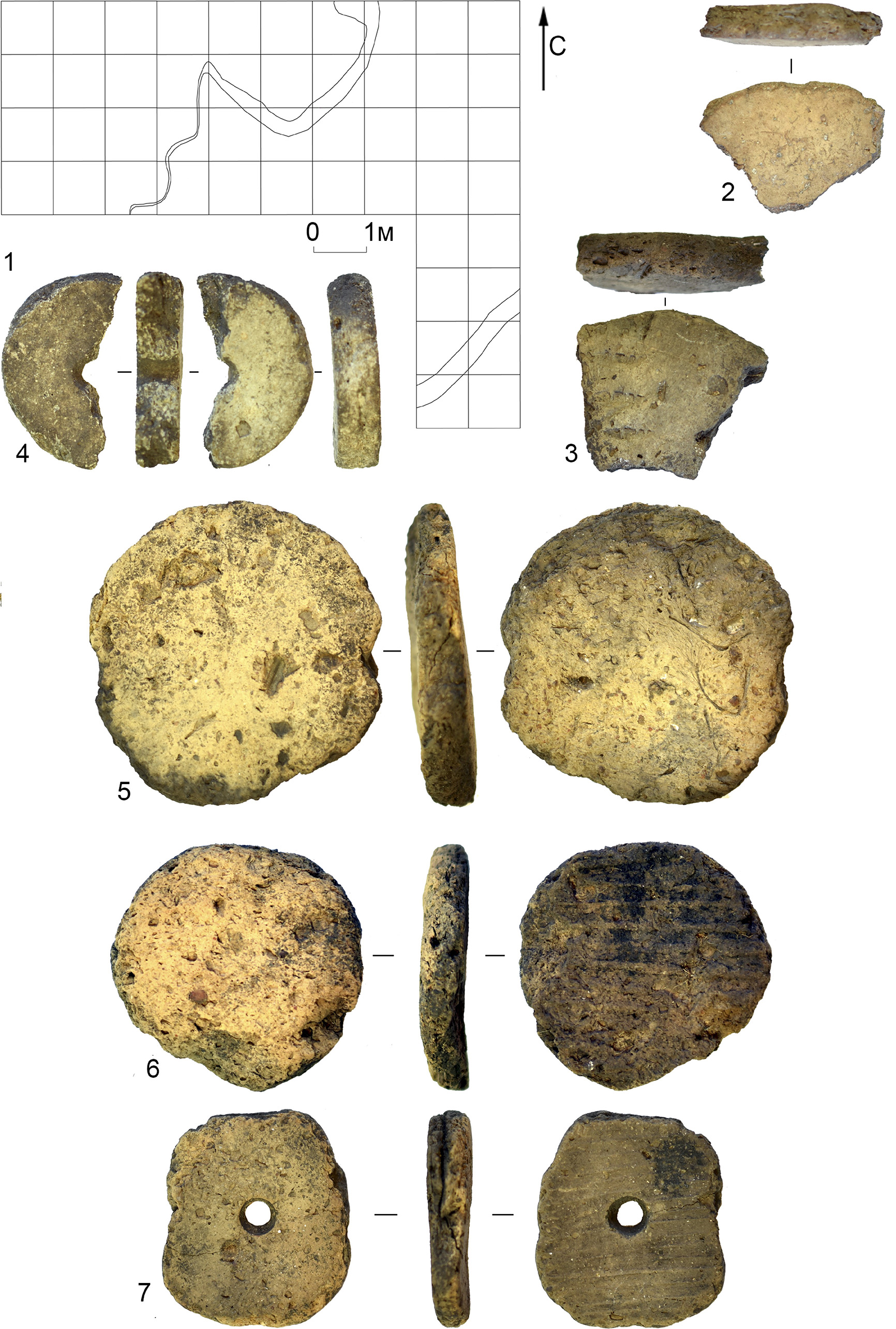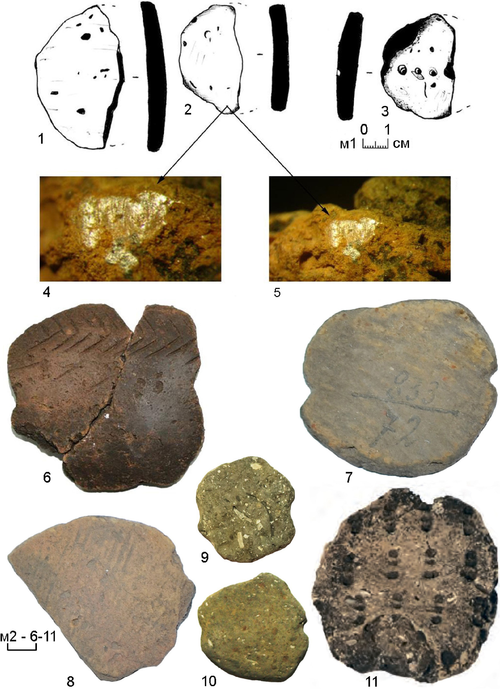 В публикации отсутствуют, а в отчете отмечено еще 5 обломков изделий округлой формы с затертыми краями, но без желобков для привязывания (рис. 14: 1–3, 6, 7). Все они сделаны из обломков стенок сосудов среднестоговской культуры [25]. Трасологических исследований по всем этим предметам пока не проводилось, поэтому предметы могли использоваться в качестве скребков или керамических грузиков для рыболовных сетей.