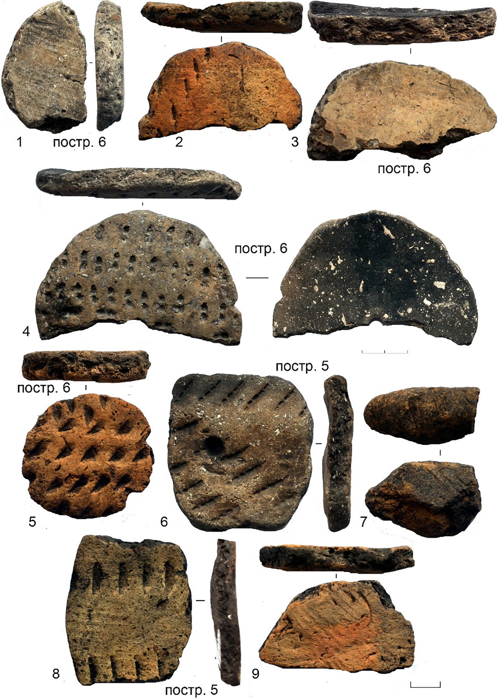 Всего выявлено 23 изделия, сделанные из обломков керамических стенок сосудов только среднестоговской культуры. 14 из них обнаружены в постройке 6 (рис. 11; рис. 12; рис. 13: 2–5), одно в постройке 1 (рис. 10: 5), два – в постройке 5 (рис. 13: 5, 6), остальные шесть предметов – в культурном слое поселения (рис. 10: 3, 4, 6; рис. 13: 1, 7, 9). Два предмета с отверстием посередине, возможно, относятся к типу пряслиц (рис. 10: 4; рис. 11: 4), два также с отверстием, но слишком большого размера (рис. 12: 2; рис. 13: 4), вероятно, все же рыболовные грузики, для пряслиц они слишком крупные. Также обнаружено 11 грузиков от рыболовных сетей с симметричными пропилами по краям (рис. 10: 3, 5, 6; рис. 11: 5, 6, 7; рис. 12: 1, 3, 4; рис. 13: 5, 6). Остальные фрагментированные предметы с затертостями их краев без трасологического исследования остаются пока неясного назначении и могли использоваться как грузиками, так и скребками по коже.