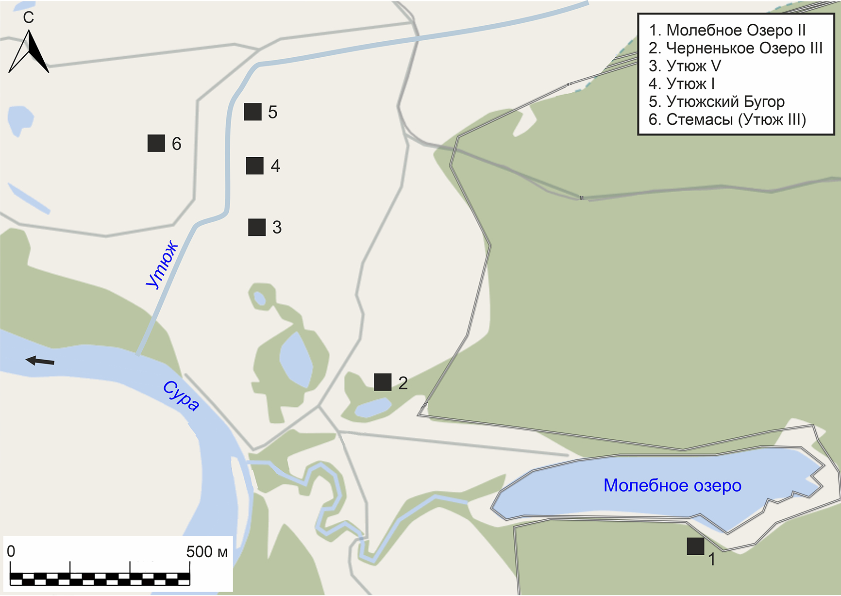 Вплоть до начала XXI в. сведения о позднем энеолите Среднего Посурья были обрывочны и противоречивы. В основном материалы указанного времени происходили из разведок и нередко не вычленялись из общего массива неолитической керамики [1, с. 81–86]. Из стационарных работ на позднеэнеолитических памятниках следует указать на раскопки В.Ф. Каховским в 1974 г. поселения Стемасы I, в слое которого были обнаружены материалы, сопоставленные автором с комплексами волосовской культуры [2, с. 8]. Значительным продвижением в изучении позднего энеолита Среднего Посурья явилось организация и проведение совместных археологических экспедиций ЧГИН (Н.С. Березина, Е.П. Михайлов), СГПУ (А.А. Выборнов, А.И. Королев), УлГУ (А.В. Вискалин), ПГПУ (В.В. Ставицкий) и ИА РАН (В.В. Сидоров) проходивших в период с 2006 по 2011 гг. За это время стационарным раскопкам подверглось четыре памятника с позднеэнеолитическими материалами (Утюж I, Утюж V, Утуюжский Бугор, Черненькое Озеро III). Ряд памятников известен по разведкам (Утюж III (Стемасы), Молебное Озеро II, Китай-Озеро) (рис. 1; рис. 2). Результаты исследований частично опубликованы [3, с. 14–23; 4, с. 61–75; 5, с. 41–72; 6, с. 156–182]. В настоящее время одной из актуальных задач является характеристика и интерпретация позднеэнеолитических материалов.
