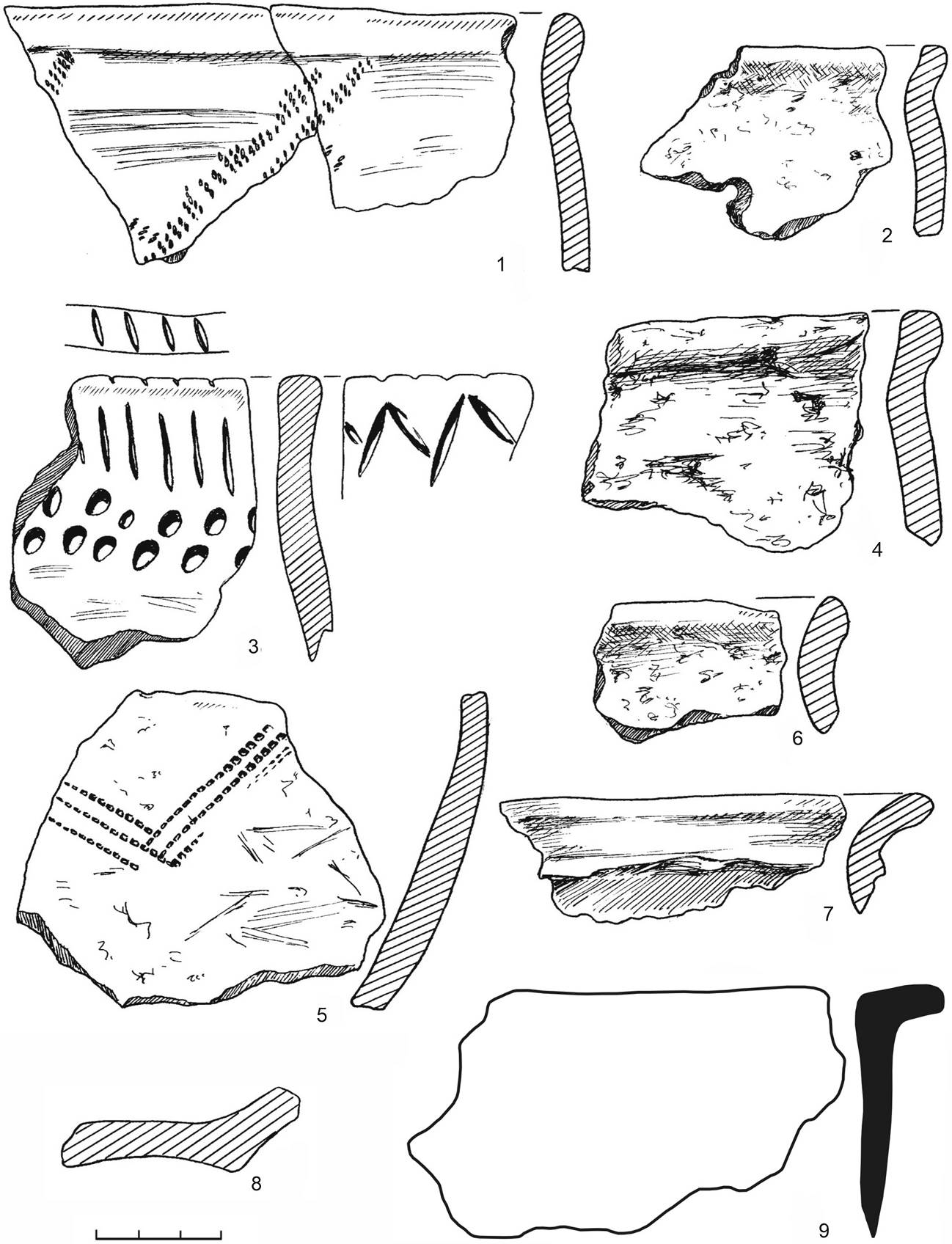 Рисунок 6 – Керамика третьей группы позднеэнеолитических памятников Среднего Посурья. 1–8 – фрагменты венчиков, стенок и днищ с поселения Черненькое Озеро III; 9 – венчик с поселения Молебное Озеро II