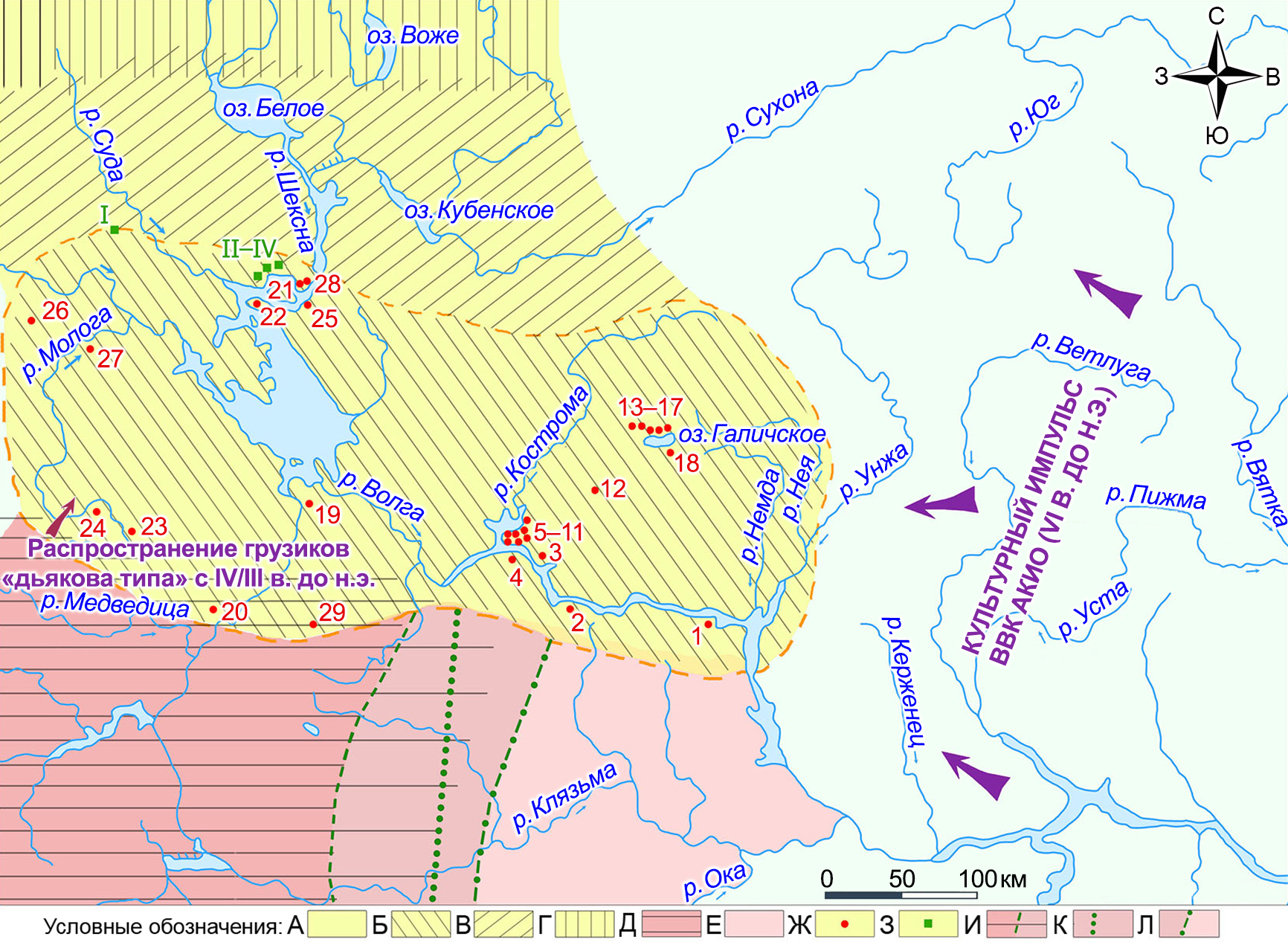 Рисунок 1 – Культурная ситуация на Верхней Волге в VI–III вв. до н.э. Локальные культурные образования с гибридными типами керамики и сопредельные древности (по А.В. Новиков; 2022). А – культурное пространство с керамикой гибридных типов и ВВК АКИО; Б – ареал поселений с керамикой ВВК АКИО, сетчатой и гибридной «типа Ватажка»; В – близкие культурные образования с керамикой гибридных типов (ВВК АКИО с носителями традиций сетчатой, подштрихованной и заглаженной керамики). Регион Белозерья и Верхней Сухоны; Г – позднекаргопольские древности, круг культур с ананьинскими элементами; Д – территории, занятые носителями дьяковских культурных традиций; Е – поселения с сетчатой и заглаженной керамикой позднеакозинского и постакозинского времени; Ж – поселения Верхней Волги с сетчатой керамикой, керамикой ВВК АКИО и гибридных типов (1 – Серюпитинское городище; 2 – Пеньковское городище; 3 – Минское городище; 4 – городище в г. Костроме; 5 – поселение Ватажка; 6 – поселение Шунга; 7 – поселение Хреново; 8 – поселение Станок I; 9 – поселение Станок II; 10 – поселение Борань; 11 – поселение Некрасовское; 12 – поселение Медведки II (Шача); 13 – городище Унорож; 14 – городище Брюхово; 15 – поселение Быки (Пуп); 16 – поселение Вознесенское II; 17 – поселение Умиленье; 18 – поселение Челсма; 19 – городище Городок; 20 – городище у Калязина; 21 – поселение Нифантово II; 22 – Череповецкое городище; 23 – городище Бежецк; 24 – городище Еськи; 25 – поселение «Дом охотника 1»; 26 – поселение Усть-Белая; 27 – поселение Куреваниха XIII; 28 – поселение Нифантово III; 29 – поселение Устьинское); З – ряд поселений с сетчатой керамикой бассейна рр. Суды и Шексны (I – Никольское XV, II – Ягорба 16, III – Ягорба, 25, IV – Ягорба 26); И – участок восточной границы распространения памятников дьяковской культуры (по И.Г. Розенфельдт, 1974 и И.В. Ислановой, 2002); К – участок восточной границы распространения памятников дьяковской культуры (по М.Г. Гусакову, 2007); Л – участок восточной границы распространения памятников дьяковской культуры (по К.А. Смирнову, 1974)