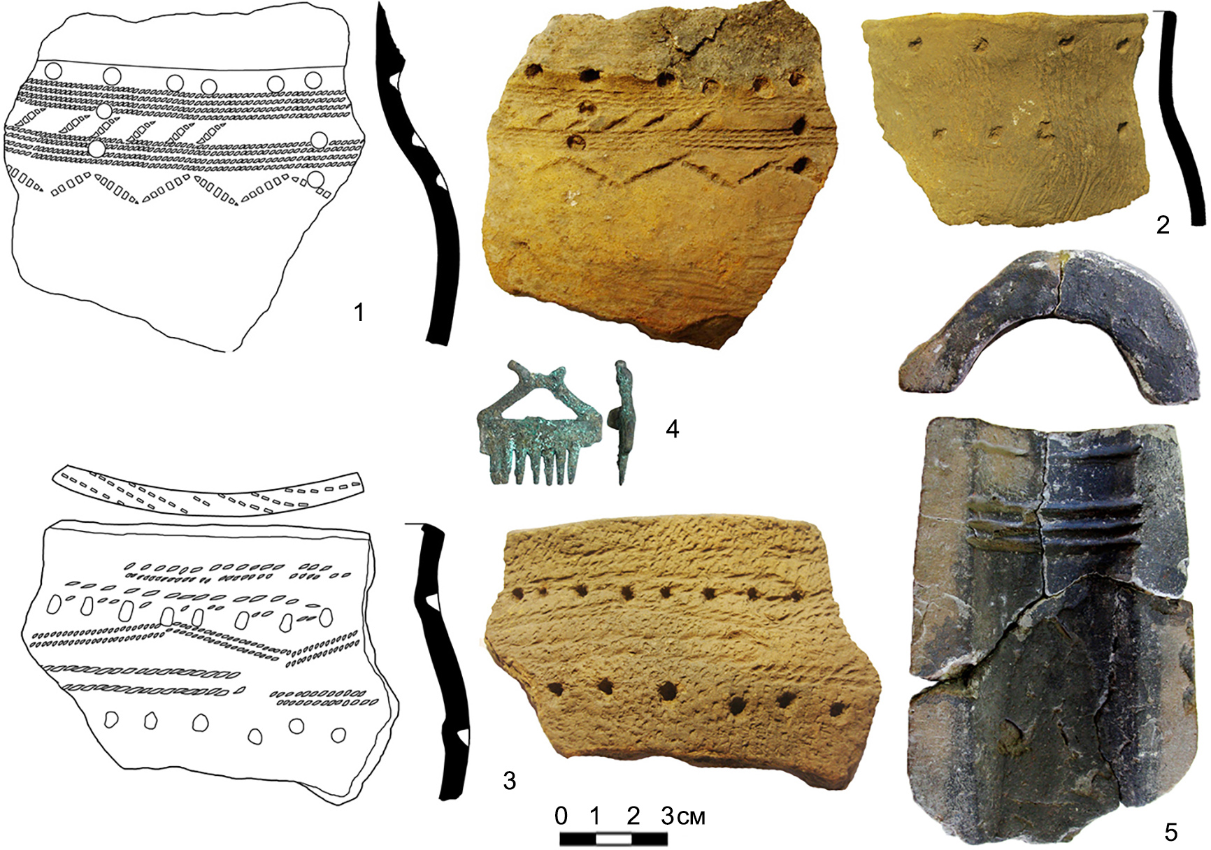 Эти контакты стали основанием для глубокой социокультурной трансформации в Верхневолжском регионе, завершившейся к V в. до н.э. В результате сформировалось население, сочетающее в своей материальной культуре местные (сетчатые) и ананьинские черты. Наступившие изменения выразились появлением на поселениях своеобразной гибридной посуды, несущей традиции обеих общностей, бытовавшей вплоть до III/II в. до н.э. [2, с. 382–405] (рис. 2: 1–3). Взаимодействие жителей Костромского региона с представителями культурных образований Волго-Камья документирует и ряд индивидуальных предметов, связанных с АКИО. Например, глиняная литейная форма для отливки кельта акозинско-меларского типа из поселения Ватажка [3, с. 77] и гребень из цветного металла, украшенный редуцированными изображениями головок лошади из городища Унорож [4, с. 146] (рис. 2: 4, 5).