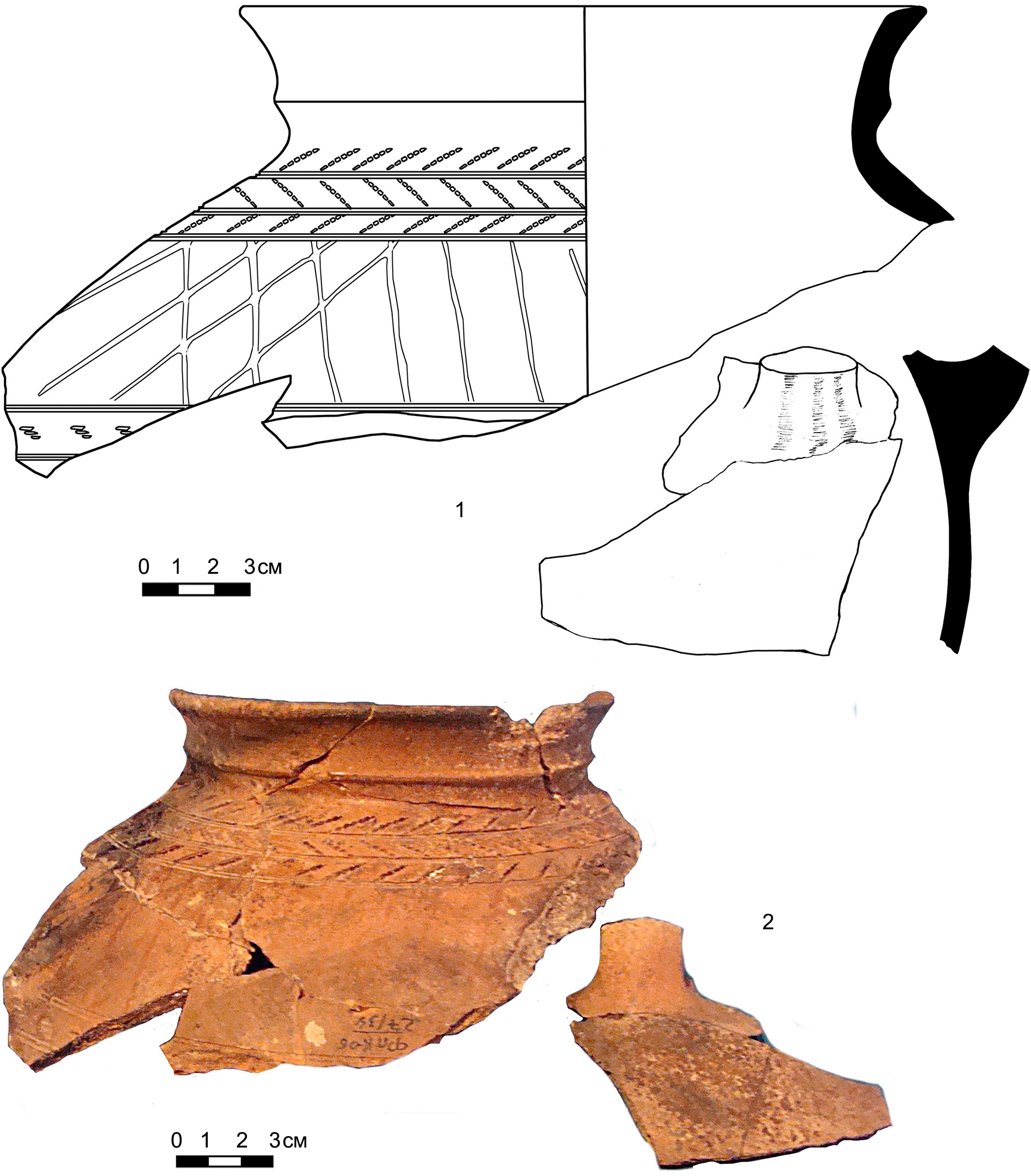 Рисунок 6 – Развал корчаги с территории завода «Фанплит», г. Кострома, 2006 г. (1 – рисунок; 2 – фото)