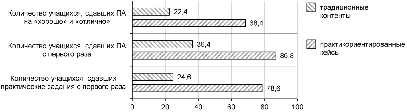Для подтверждения гипотезы влияния практикоориентированных кейсов на повышения качества обучения был проведен анализ результатов обучения во время семестра (при изучении дисциплин) и результатов промежуточной аттестации (ПА) (рис. 2). Результаты анализа показали, что количество учащихся освоивших контент и сдавших успешно задания во время контактных часов увеличилось с 24,6% до 78,6%, или в 3,2 раза; количество учащихся, сдавших зачет/экзамен по дисциплинам с первого раза выросло с 36,4% до 86,8%, или в 2,4 раза; количество учащихся, сдавших ПА на «хорошо» и «отлично» увеличилось с 22,4% до 68,4%, или в 3 раза, что говорит об успешности результатов эксперимента по внедрению практикоориентированных кейсов.
