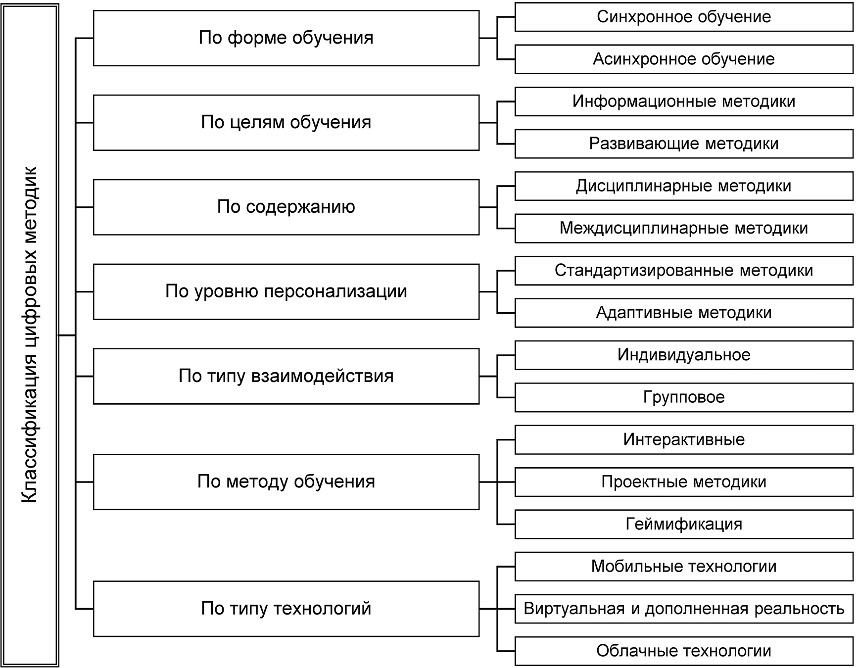 Цифровые методики обучения можно классифицировать по различным критериям, в зависимости от целей, формата, технологий и методов взаимодействия. Результаты проведенной нами классификации цифровых образовательных методик по семи критериям представлены ниже (рис. 1).