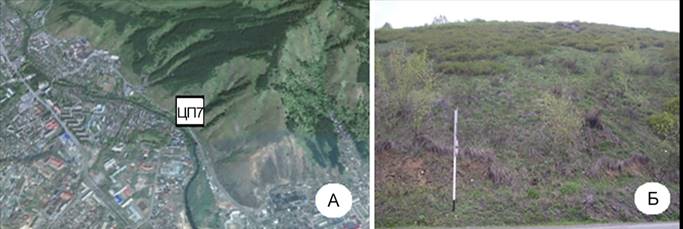 ЦП7 расположена в правобережье реки Майма в окрестностях города Горно-Алтайска на высоте 296 м над ур. м.; координаты 51°57ʹ52,0ʺ с.ш., 85°55ʹ19,3ʺ в.д. (рис. 6: А, Б).