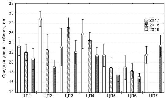 Неоднородной была также изменчивость этого признака в одном и том же местообитании по годам. Так, в ЦП2 более высокорослыми были побеги в 2017 г., по сравнению с 2019 годом (р-level = 0,0001) (рис. 8).