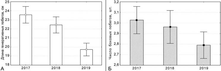 Возможно, развитие боковых побегов могло незначительно уменьшиться в 2019 году в связи с погодными условиями двух предыдущих лет, то есть времени заложения почечных инициалий. Согласно метеосводке, в 2017–2018 гг. зимы были малоснежными, а весенние месяцы сопровождались большой положительной аномалией температурного режима в первой половине года [18, с. 8–9; 19, с. 7–10]. Тем не менее достоверных отличий по числу боковых побегов в разные годы проведения исследований в средних выборках из всех ЦП нами не выявлено. Вероятно, данный признак является одним из ключевых для роста и развития растений, поэтому особи вида сохраняли число метамерных структур генеративного побега даже при минимизации его длины из-за неблагоприятных погодных условий периода вегетации в 2019 году [17, с. 7–8].