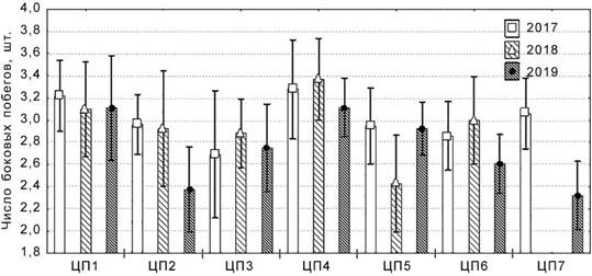 Число боковых побегов – ключевой признак, который определяет развитие фотосинтетической поверхности особей и играет важную адаптивную роль. В течение трехлетнего периода наблюдений в среднем по выборкам из всех изученных ЦП нами не выявлено достоверных отличий по данному признаку. Тем не менее в 2019 году нами отмечено несколько более низкое число боковых побегов по всей выборке, по сравнению с изученными в 2017–2018 годы (рис. 9: Б).