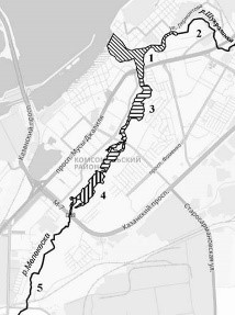 Рисунок 1 – Схемы выделенных для исследования участков долин рек Шукралинка и Мелекеска (уч. 1–5, объяснения в тексте), г. Набережные Челны