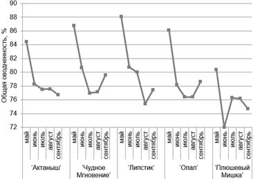 Рисунок 1 – Динамика показателей общей оводненности некоторых сортов хризантем (в среднем за 3 года)
