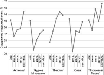 Рисунок 3 – Динамика показателей содержания подвижной влаги некоторых сортов хризантем (в среднем за 3 года)