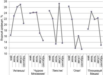 Рисунок 4 – Динамика показателей водного дефицита некоторых сортов хризантем (в среднем за 3 года)