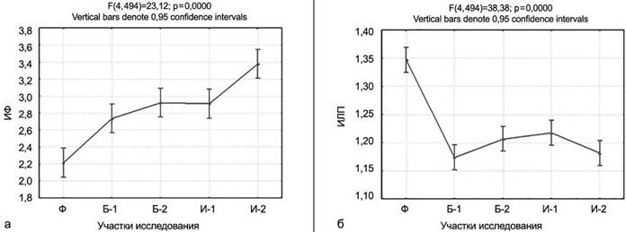 Рисунок 1 – Изменение ИФ и ИЛП в градиенте техногенной трансформации окружающей среды