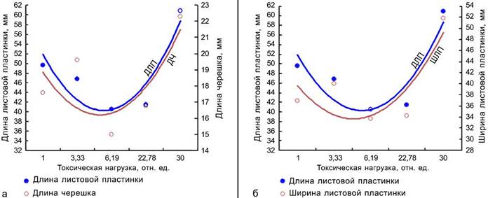 Изменяется индекс листа (ИЛ) – отношение длины листовой пластинки к длине черешка. Установлена тесная корреляционная взаимосвязь между длиной листовой пластинки и длиной черешка (r = 0,54–0,74; n = 100; p < 0,01–0,001) и длиной и шириной листовой пластинки (r = 0,73–0,83; n = 100; p < 0,001) у растений со всех исследуемых участков. Слабая токсическая (Б-1) нагрузка стимулирует рост черешка (рис. 2: а). В условиях максимального загрязнения все исследуемые параметры увеличиваются по сравнению с фоновым и остальными участками. На буферных (Б-1 и Б-2) и слабо загрязненном участке импактной зоны (И-1) длина и ширина листовой пластинки значимо меньше, чем на фоновом (табл. 2, рис. 2: б).
