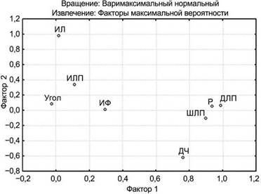 Важное значение имеет определение показателей, которые вносят наибольший вклад в изменчивость формы листа. Выделение группы диагностических показателей выполнено факторным анализов (методы: главных компонент и факторов максимальной вероятности; вращение (поворот): варимаксимальное нормализованное). Суммарная информативность трех факторов, выделенных методом главных компонент – 85%, т.е. выделенные факторы объясняют 85% суммарной дисперсии признака «форма листа». Фактор 1 объясняет 44% дисперсии, фактор 2 – 21%, фактор 3 – 20%. Так, положительный полюс первого фактора определяется ДЛП, ШЛП, ДЧ, РВШ. Второй фактор определяется положительной факторной нагрузкой ИФ, Угол, третий – положительной факторной нагрузкой ИЛП, ИЛ (рис. 4). Извлечение признаков методом факторов максимальной вероятности выделило 2 фактора, которые определяют 60% суммарной дисперсии исследуемого признака: Фактор 1 – положительные факторные нагрузки приходятся на ДЛП, ШЛП, ДЧ, РВШ; фактор 2 – на ИЛ (рис. 4). Таким образом, переменные имеют большие факторные нагрузки для первого (ДЛП, ШЛП, ДЧ, РВШ) фактора (42%) и меньшие (18%) для второго (ИЛ).