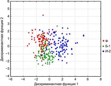 На основании комплекса пяти признаков, определяющих форму листа, проведен дискриминантный анализ (рис. 5). Различия по форме листьев у растений из фоновой, буферной и импактной зон высоко статистически значимы по дискриминантным функциям (F (10; 584) = 50,16; p < 0,001). Точность разделения листьев B. pendula по зонам загрязнения составляет 79,3%. Самая высокая точность выделения листьев участка И-2 (82,0%). В выделении листьев с участков Ф и Б-1 наблюдается большее число ошибок. Точность выделения листьев фонового участка – 76,78%, Б-1 – 79,0%. Листья B. pendula группируются в три «облака» по принадлежности к зонам техногенной трансформации почвы, но четкая граница между зонами отсутствует. Близко располагаются облака фоновой (Ф) и буферной зон (Б-1). Квадрат расстояния Махаланобиса (MSD) равен 3,0 отн. ед. Листья B. pendula, произрастающей в импактной зоне на максимально загрязненной территории (И-2) отличаются от растений из остальных зон загрязнения. MSD дистанция Ф – И-2 равна 8,0 отн. ед., Б-1 – И-2 – 5,6 отн. ед.