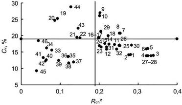 Для анализа структуры морфологической изменчивости признаков Н.С. Ростова [6, с. 274] предлагает оценивать соотношение общей (коэффициент вариации признака – Cv, %) и согласованной (усредненный по признаку квадрат коэффициента корреляции – Rch²) изменчивости [22, с. 107]. По индикаторной роли в формировании морфологической структуры листа для B. pendula изучаемые признаки распределены в четыре группы (рис. 6).