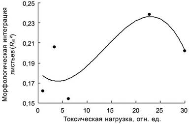 Изучение закономерностей изменения уровня морфологической интеграции листьев в градиенте техногенной трансформации почв показало, что для B. pendula характерна защитно-стрессовая онтогенетическая стратегия (рис. 7). В градиенте токсической нагрузки при ухудшении условий роста растений у B. pendula вначале происходит усиление адаптивного потенциала, направленного на укрепление целостности структуру, что выражается в увеличении индекса R²m от 0,14 до 0,24 – проявляется защитная компонента. Дальнейшее усиление стресса приводит к исчерпанию адаптивного потенциала и разбалансировке координированности развития на морфологическом уровне. Следствием чего является снижение R²m от 0,24 до 0,20. В этом проявляется стрессовая компонента онтогенетической стратегии.