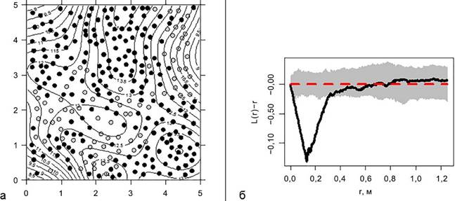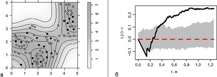 Рисунок 2 – Пространственная структура размещения O. floribunda в исследуемой ценопопуляции: а – карта-схема локальной плотности (серые кружки – прегенеративные особи, черные кружки – генеративные особи; темно-серые участки соответствуют более высоким значениям плотности особей); б – поведение функции Рипли