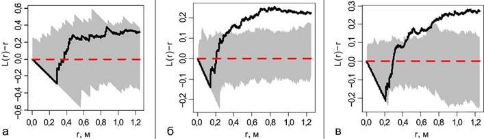 Рисунок 3 – Типы поведения функции Рипли для ценопопуляции O. floribunda: а – генеративные особи, б – прегенеративные особи, в – взаимное размещение генеративных и прегенеративных особей