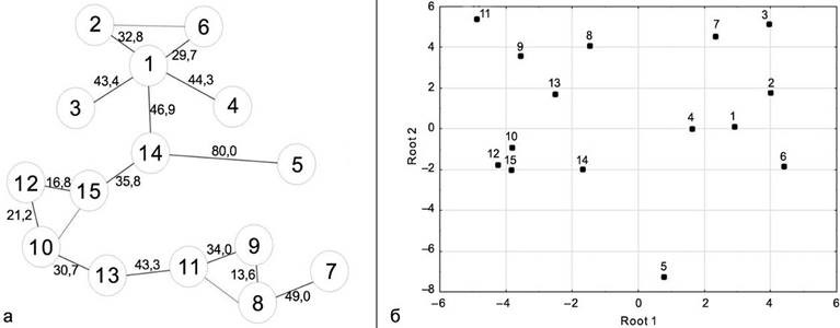 Рисунок 2 – Ординация биотопов растительности окрестностей дер. Октябрьск: а – методом максимального корреляционного пути (цифрами указан квадрат расстояния Махаланобиса); б – в первых осях дискриминантных функций (Root_1, Root_2)