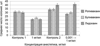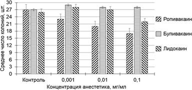 Результаты исследования влияния растворов анестетиков на число колоний A. niger Tiegh. представлены на рис. 1.