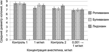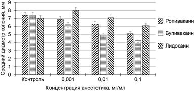 Ропивакаин и бупивакаин ингибируют рост мицелия сильнее, чем лидокаин (р < 0,05). Лидокаин в концентрации 0,001 мг/мл оказывает стимулирующее действие на рост мицелия, но с повышением его концентрации наблюдается ингибирование роста аспергилла.