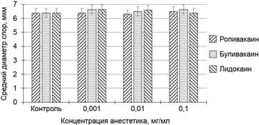Мы провели измерение диаметра спор и обнаружили, что все исследуемые анестетики в избранных концентрациях достоверно не влияют на размер спор (рис. 4). Можно предположить, что анестетики влияют на ростовые процессы самого мицелия, не затрагивая начальные этапы прорастания спор.