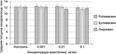 Рисунок 5 – Влияние анестетиков амидного ряда разной концентрации на толщину конидиеносцев A. niger Tiegh.