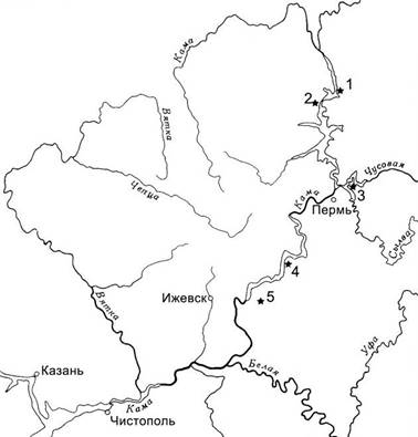 Рисунок 1 – Карта расположения археологических памятников камской культуры на территории Среднего Предуралья, на которых изучены жилища (1 – Хуторская, 2 – Усть-Залазнушка II, 3 – Лёвшино, 4 – Чернашка, 5 – Усть-Букорок)