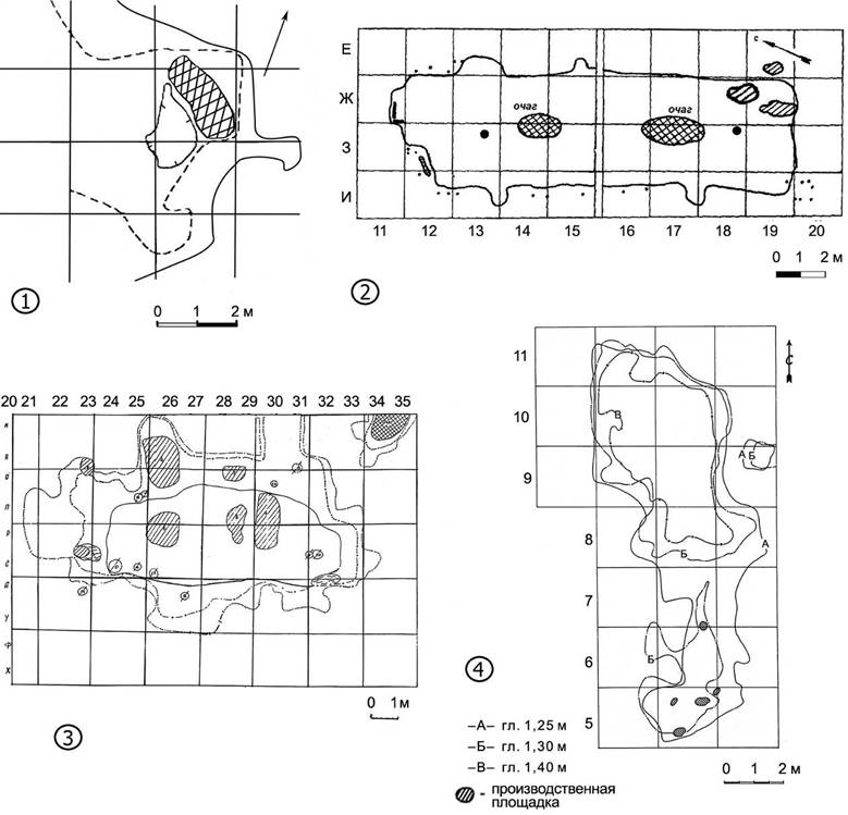 Рисунок 2 – Жилища камской культуры: 1 – Усть-Букорок, 2 – Хуторская, 3 – Чернашка, 4 – Усть-Залазнушка II