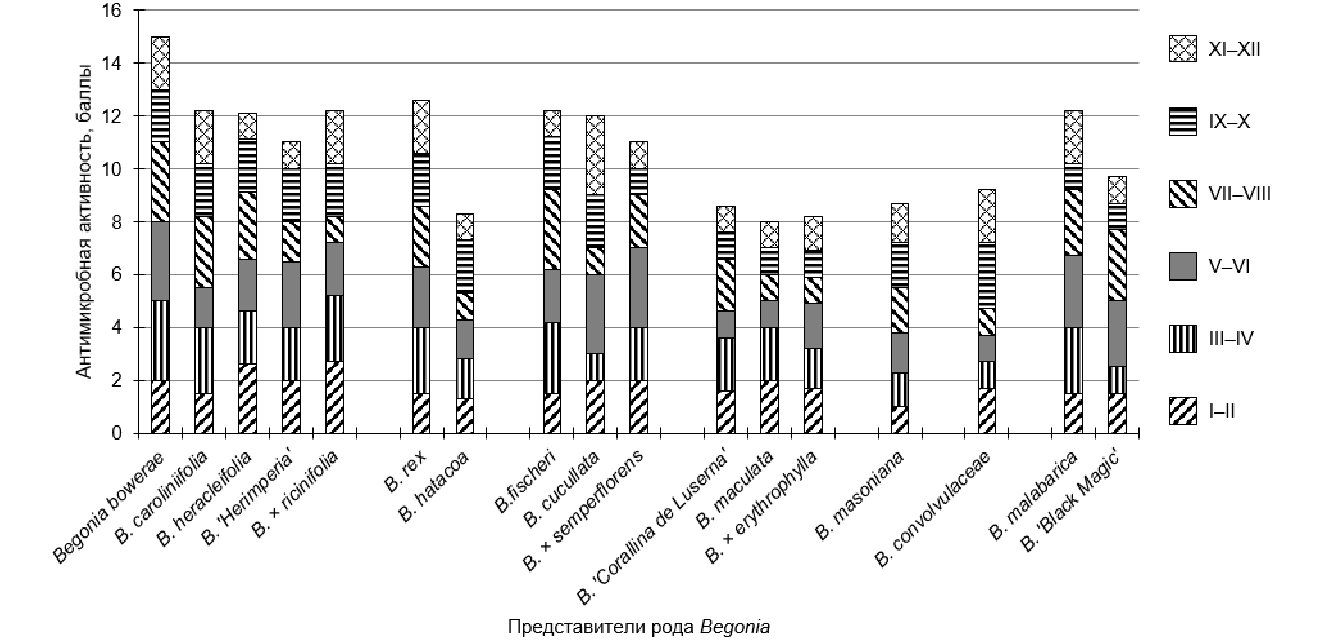 В таблице 1 представлены таксономическая классификация бегоний по секциям и количественные (сумма баллов за год и средний балл) и качественные показатели специфичности антимикробной активности.